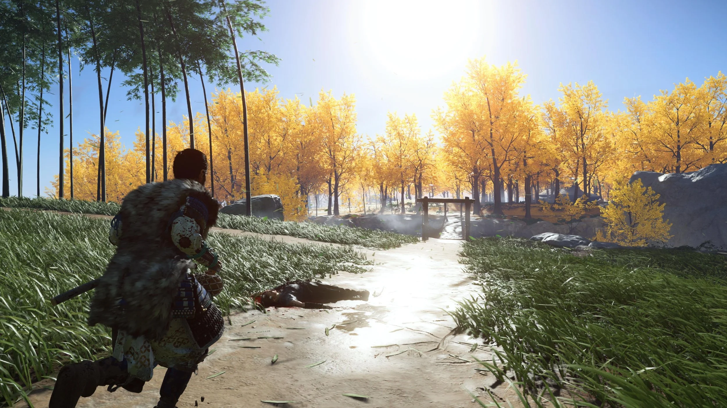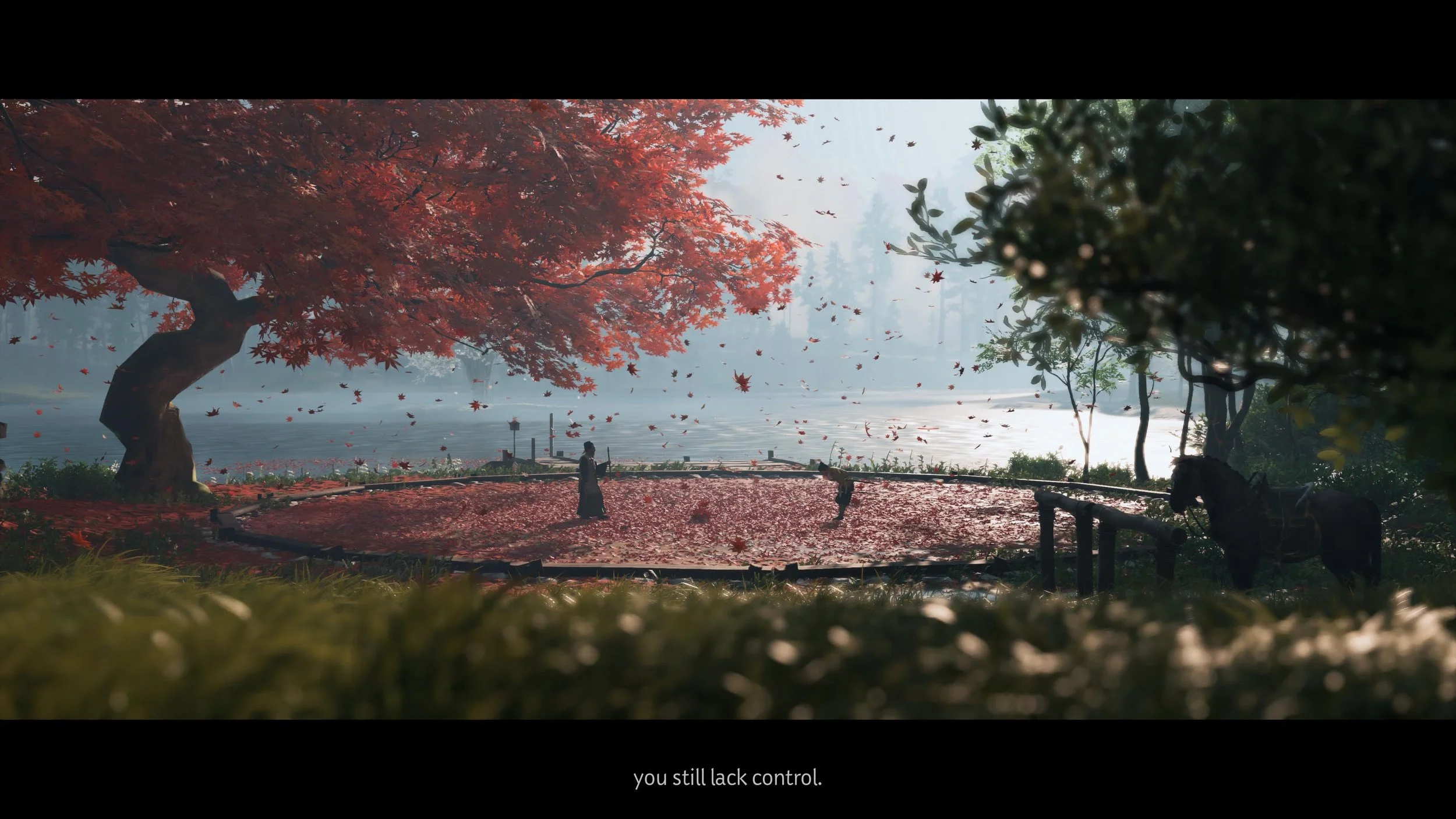 There's a sequence early in the game where Jin is experiencing a flashback to his youth. In this memory, his Uncle Shimura is demonstrating the basics of swordplay. This sequence takes place within a combat ring covered in bright red maple leaves that have fallen from a huge maple tree that sits above it. Farther in the distance, you can see a vast river flowing into a mountain range that disappears into the bright sun. In any other video game, this backdrop may have looked really good, but in Ghost of Tsushima, it presents as art in motion. This scene is painted with vibrant colors that pop confidently off the screen, paired with leaves, wind, and a river gently flowing in harmony with each other to create an absolutely awe-inspiring visual feast. Moments like these are present in nearly every moment of the game. Whether you're in a combat standoff taken straight from Samurai cinema, or riding your horse aimlessly through the brighter-than-heaven Golden Forest, Ghost of Tsushima not only never gives you a reason to look away, it demands every moment of your attention. It's loaded with cinematic moments that leave you speechless, and an art direction that will leave you awe-inspired, and even hard-pressed to look at another video game.