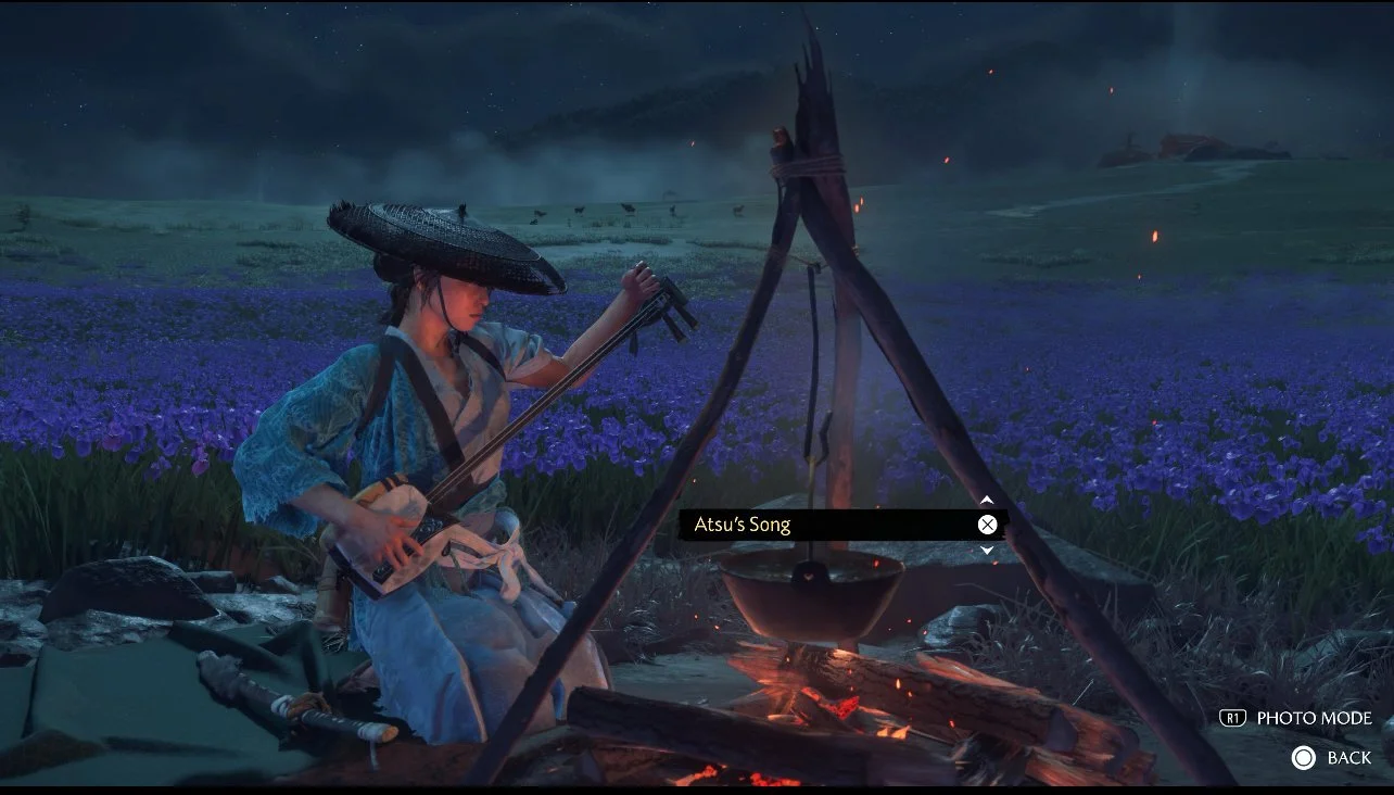 Last, but certainly not least, are camps, a new addition to the Ghost open-world formula. Camping allows you to cook food, refill ammo, rest, and play your shamisen. However, whenever you camp, you'll be greeted by a traveler who will sit down at your fire...uninvited. Exhaust their dialogue, and they'll reveal a nearby POI for you to explore. At first, I enjoyed these little encounters, as they felt like an authentic, immersive part of the wandering experience. However, after the 10th or 11th wanderer approached my camp to let me know that a bamboo site was nearby, the encounter began to feel stale. While they approach, the game quickly cuts to Atsu contemplating grabbing her sword to defend herself. This got me thinking that perhaps an opportunity was missed with the camping mechanic. What if there were always a slim chance that the wanderer approaching your camp was actually an enemy looking to take Atsu out to collect her bounty? This would add a risk element to the experience that would make it feel more fun and more in-depth.