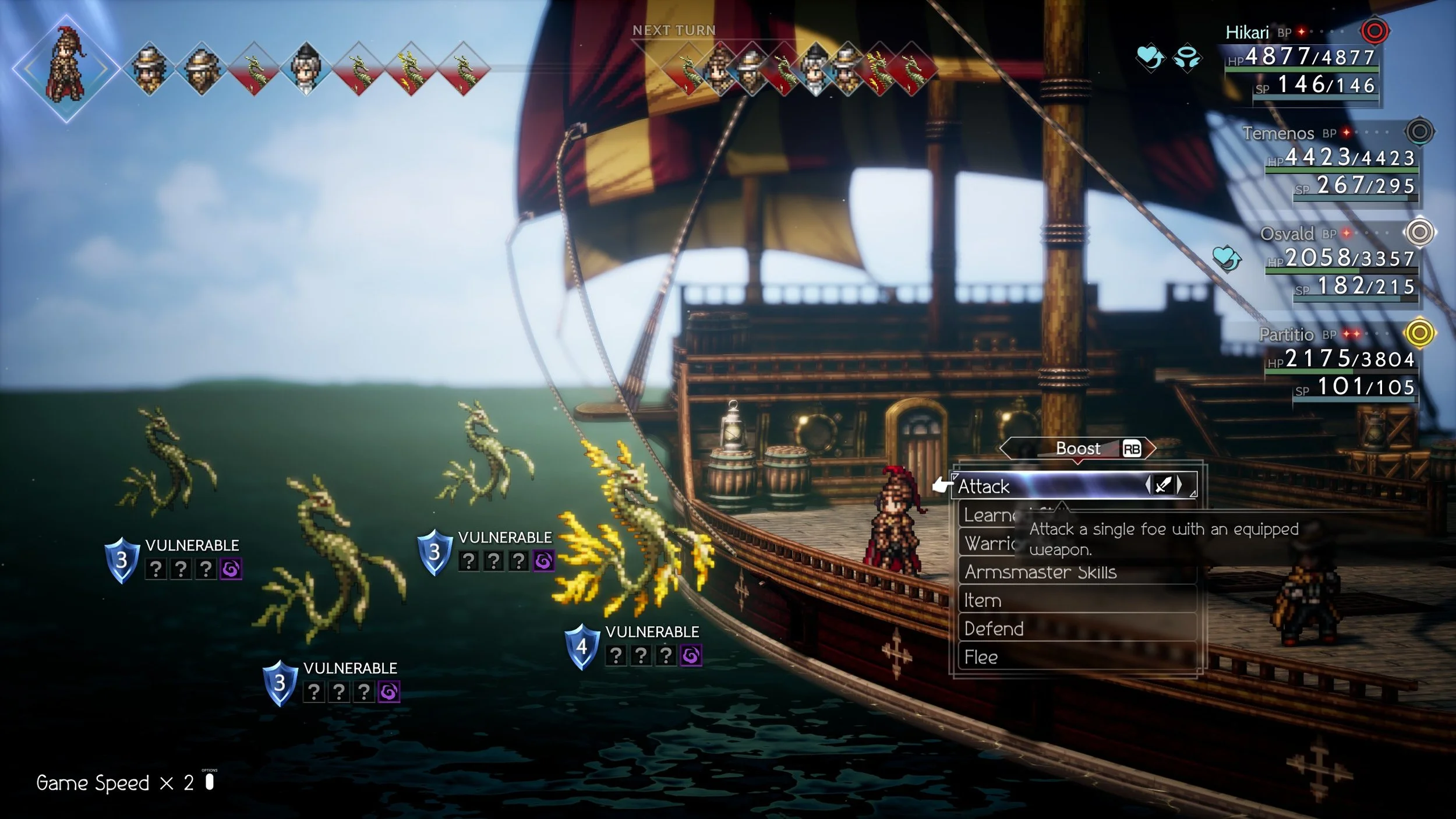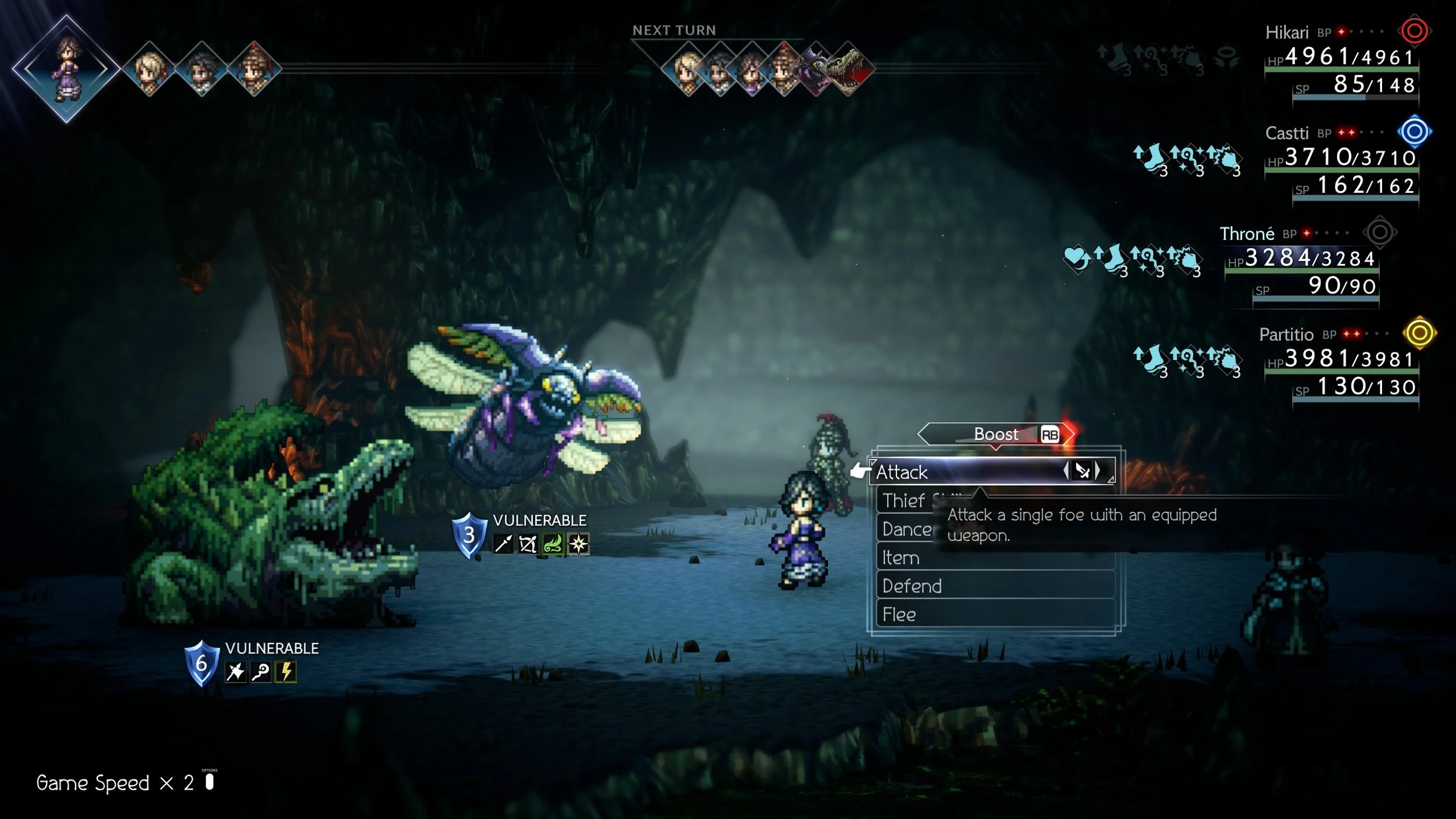 As the series that essentially got me into turn-based combat, I was pretty excited to get more of it in Octopath II. It then came as a welcome surprise then, that Octopath II's combat system came loaded with subtle but impactful balancing paired with smart additions that give you the tools for success without giving you an "I win" button. Firstly, abilities have been balanced so as not to allow the player to become overpowered too easily. For example, in the first game, stacking Cyrus' scholar ability stacked with the sorcerer subclass could turn him into an unstoppable magic damage dealer. However, in the sequel, magic abilities have been more evenly distributed, and must be more strategically considered when going into a fight. For example, Osvald cannot deal light damage unless he's given the cleric subclass, or wind damage unless he's given the dancer subclass -- a configuration that will drastically alter his combat composition depending on what you choose. Additionally, the divine subclasses have been reworked to act as a strategic support option, rather than the unstoppable trump cards they acted as in the first game.