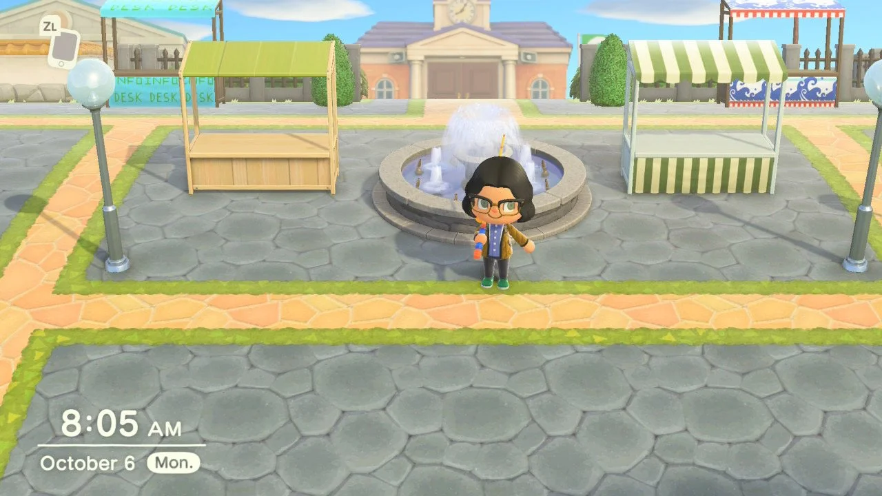 The largest update so far comes by way of pathing. I've finally provided stone pathing for the entire main section of the island, which consists of the town square, the resident services building, Nook's Cranny, and Mabel's clothing shop. Now, Beverly looks like a legitimate town that feels lived-in. The idea is that from the moment you exit the airport, you're greeted with a bustling town full of things to do, and the implementation of pathing -- which is strategically laid out to guide residents and visitors to shops and other points of interest -- is a major step towards realizing that experience.